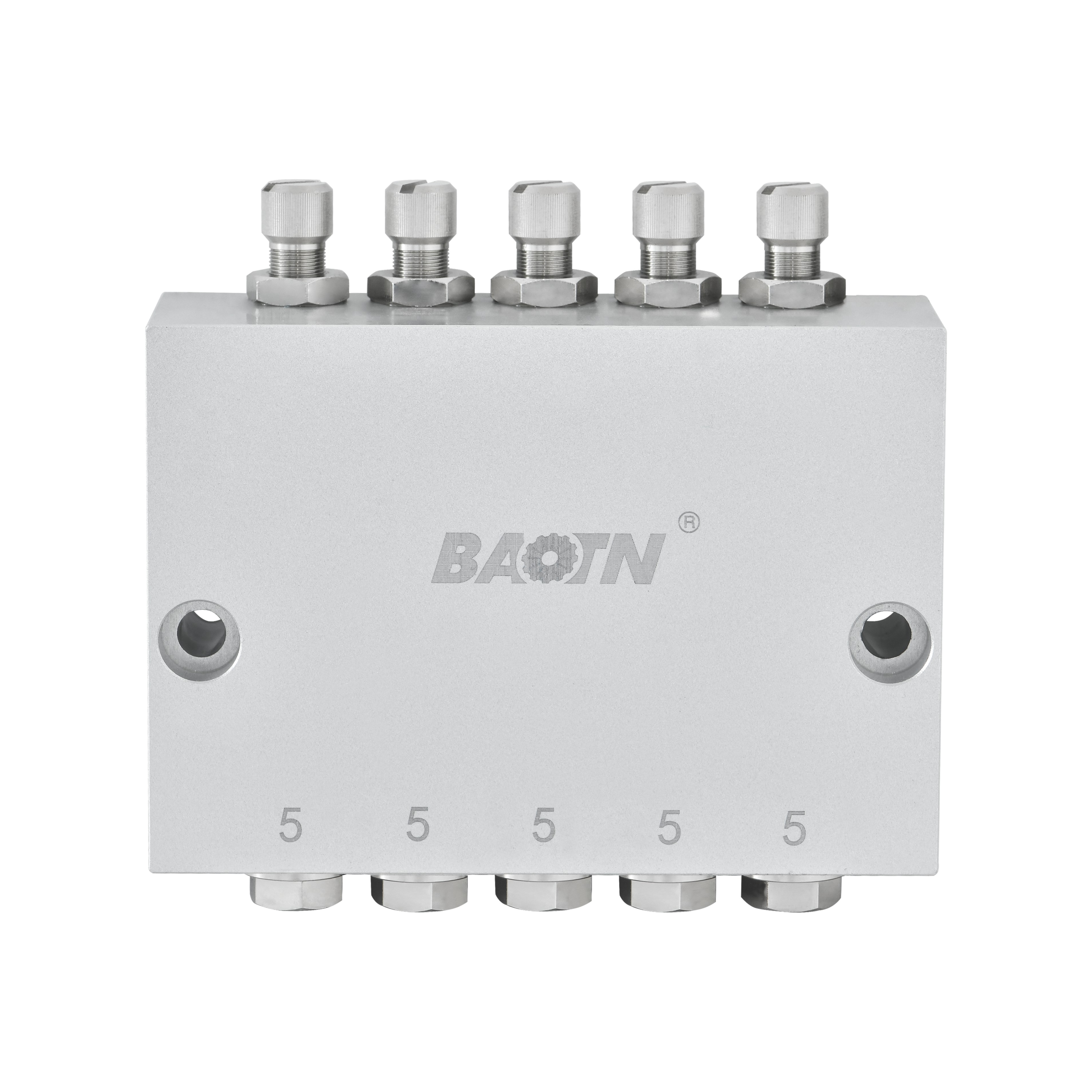 (Note: When the oil volume of all oil outlets is the same, only one oilvolume is used to indicate)Example 1: EFA-05-2 means EFA type 5-port distributor, the oil volumeof the 1st, 2nd, 3rd, 4th and 5th oil outlets is all 0.02mL/time.Example 2:EFA-05-53235 means EFA type 5-port distributor, the oilvolume of the 1st, 2nd, 3rd,4th and 5th oil outlet is 0.05,0.03, 0.020.03,0.05 mL/time respectively.